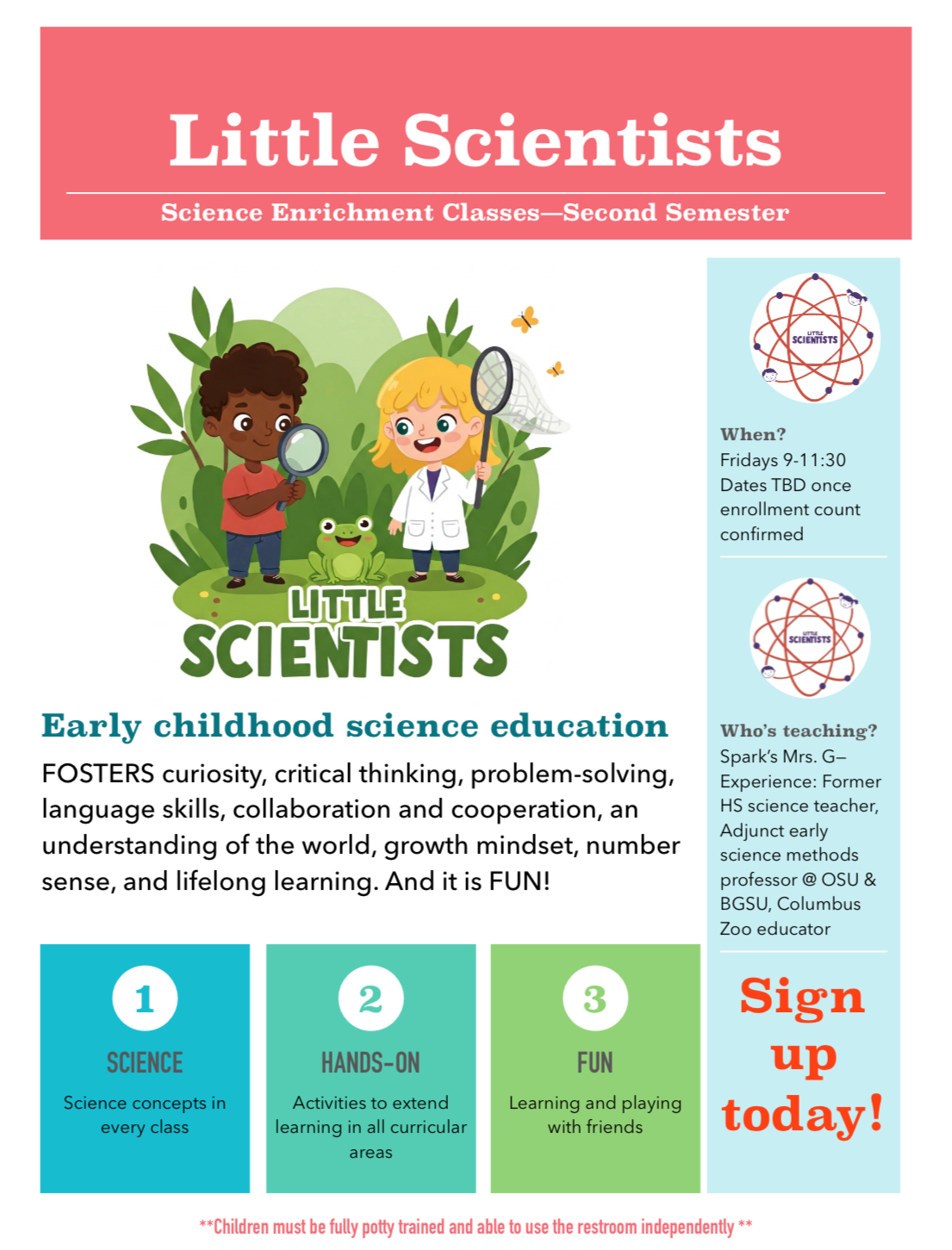 Little Scientists is an opportunity for your preschooler to add an additional day at Spark with a focus on science led by Mrs. G!